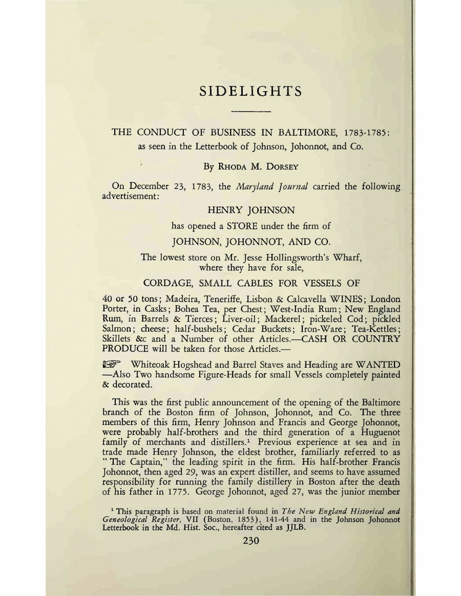 SIDELIGHTS THE CONDUCT OF BUSINESS IN BALTIMORE, 1783-1785: as seen in the Letterbook of Johnson, Johonnot, and Co. By Rhoda M. Dorsey On December 23, 1783, the Maryland Journal carried the following advertisement: HENRY JOHNSON has opened a STORE under the firm of JOHNSON, JOHONNOT, AND CO. The lowest store on Mr. Jesse Hollingsworth's Wharf, where they have for sale, CORDAGE, SMALL CABLES FOR VESSELS OF 40 or 50 tons; Madeira, Teneriffe, Lisbon & Calcavella WINES; London Porter, in Casks; Bohea Tea, per Chest; West-India Rum; New England Rum, in Barrels & Tierces; Liver-oil; Mackerel; pickeled Cod; pickled Salmon; cheese; half-bushels; Cedar Buckets; Iron-Ware; Tea-Kettles; Skillets &c and a Number of other Articles.—CASH OR COUNTRY PRODUCE will be taken for those Articles.— EST* Whiteoak Hogshead and Barrel Staves and Heading are WANTED —Also Two handsome Figure-Heads for small Vessels completely painted & decorated. This was the first public announcement of the opening of the Baltimore branch of the Boston firm of Johnson, Johonnot, and Co. The three members of this firm, Henry Johnson and Francis and George Johonnot, were probably half-brothers and the third generation of a Huguenot family of merchants and distillers.1 Previous experience at sea and in trade made Henry Johnson, the eldest brother, familiarly referred to as " The Captain," the leading spirit in the firm. His half-brother Francis Johonnot, then aged 29, was an expert distiller, and seems to have assumed responsibility for running the family distillery in Boston after the death of his father in 1775. George Johonnot, aged 27, was the junior member 1 This paragraph is based on material found in The New England Historical and Geneological Register, VII (Boston, 1853), 141-44 and in the Johnson Johonnot Letterbook in the Md. Hist. Soc, hereafter cited as JJLB. 230 |