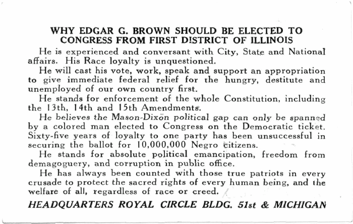 WHY EDGAR G. BROWN SHOULD BE ELECTED TO CONGRESS FROM FIRST DISTRICT OF ILLINOIS He is experienced and conversant with City, State and National affairs. His Race loyalty is unquestioned. He will cast his vote, work, speak and support an appropriation to give immediate federal relief for the hungry, destitute and unemployed of our own country first. He stands for enforcement of the whole Constitution, including the 13th, 14th and 1 5th Amendments'. He believes the Mason-Dixon political gap can only be spanned by a colored man elected to Congress on the Democratic ticket. Sixty-five years of loyalty to one party has been unsuccessful in securing the ballot for 10,000,000 Negro citizens. He stands for absolute political emancipation, freedom from demagoguery, and corruption in public office. He has always been counted with those true patriots in every crusade to protect the sacred rights of every human being, and the welfare of all, regardless of race or creed. HEADQUARTERS ROYAL CIRCLE BLDG. 51st & MICHIGAN |